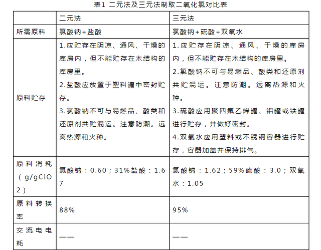 鹽酸法及硫酸法(均采用氯酸鈉為原料)對比如表1所示(由於汙水性質較為複雜,成本為某江段同原水,同工藝,同出廠餘二氧化氯量所計算成本):