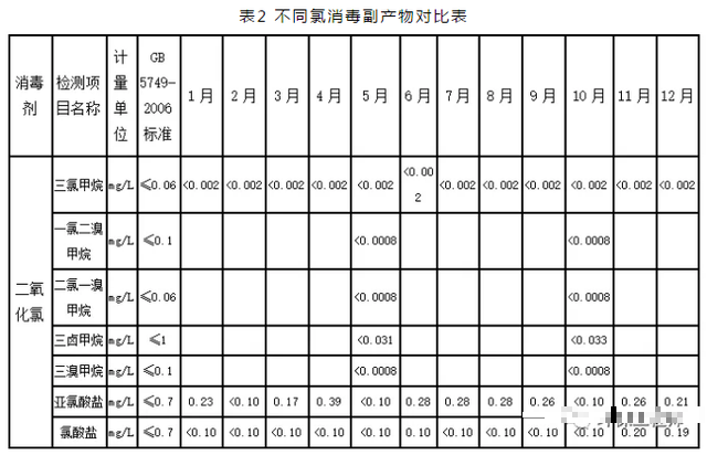 由表2可知,所有消毒方式副產物均能滿足GB5749-2006規範要求,其中:氯氣消毒產生了三氯甲烷、一氯二溴甲烷、二氯一溴甲烷、三鹵甲烷,氯酸鹽和亞氯酸鹽在大多的月份未檢出;次氯酸鈉消毒產生的副產物和液氯消毒基本相同,也產生了三氯甲烷、二氯一溴甲烷、三鹵甲烷,但含量略少於氯氣消毒,有些月份還產生一定量的亞氯酸鹽和氯酸鹽;二氧化氯消毒幾乎沒有檢出三氯甲烷、一氯二溴甲烷、二氯一溴甲烷、三鹵甲烷,但產生了氯酸鹽、亞氯酸鹽的消毒副產物。